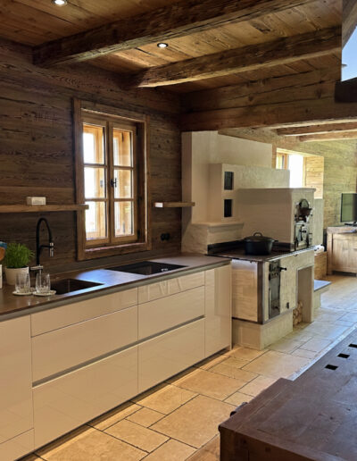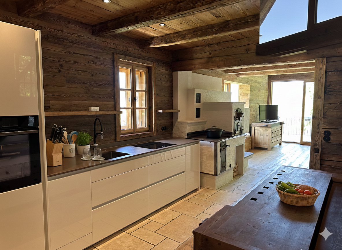 Traditionelles Kocherlebnis: Der Vorraum führt Sie direkt in die Küche, deren Herzstück ein alter, gesetzter Holzherd mit integriertem Holzbackofen ist. Das Knistern des Feuers und der Duft von frischem Holz schaffen ein unvergleichliches Heimatgefühl.