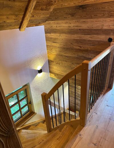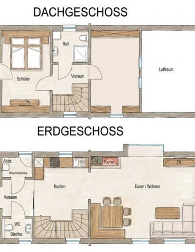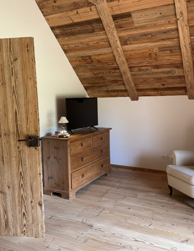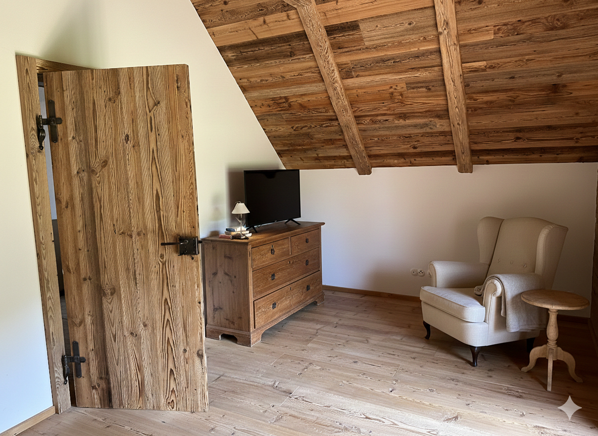 Über die 150 Jahre alte Holztreppe gelangen Sie in das gemütliche Obergeschoss, das ganz der Erholung gewidmet ist: