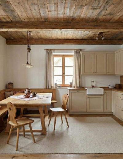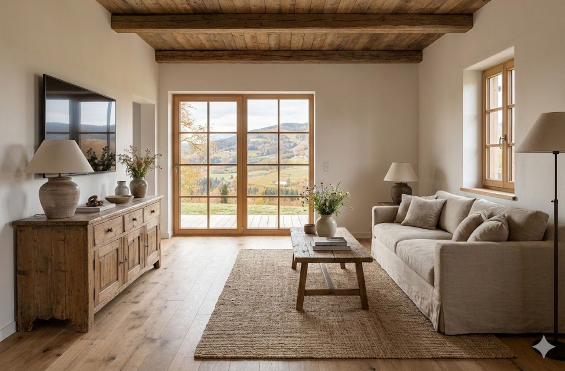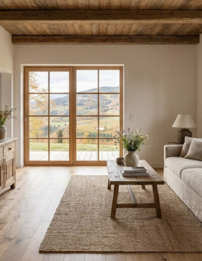 Treten Sie ein in ein Ambiente, das durch natürliche Materialien und handwerkliche Details besticht. Der offene Wohnbereich bildet das Zentrum Ihres Urlaubs: