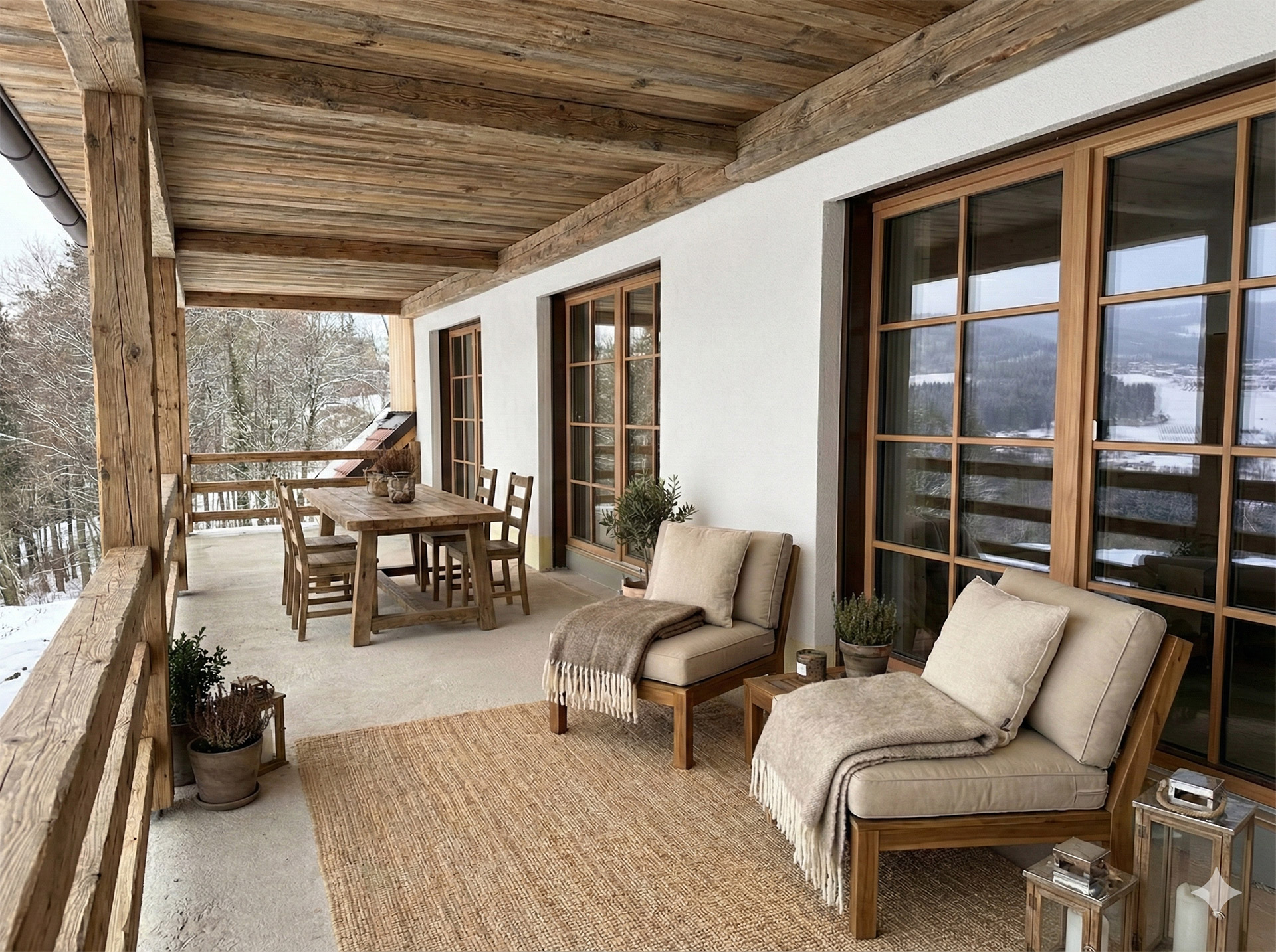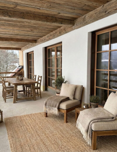 Loggia über dem Gartenreich: Vom Wohnraum, dem Schlafzimmer und dem Spa-Bereich aus haben Sie direkten Zugang zu Ihrem 30 m² großen, überdachten Balkon. Von hier oben haben Sie einen herrlichen Blick über unseren 35 Hektar großen Garten – ein privater Logenplatz, um die frische Luft und die Ruhe der Oststeiermark zu genießen.