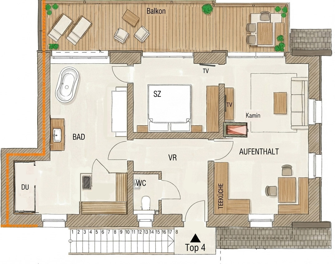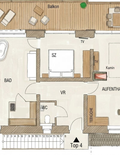 Über eine eigene Holzstiege erreichen Sie Ihr privates Reich im Obergeschoss. Das Apartment „Steirerherz“ liegt direkt über der „Wildwiese“ (rechts neben dem Apartment Gipfelglück) und bietet auf ca. 90 m² einen Rückzugsort, der Geborgenheit und Freiheit perfekt vereint.