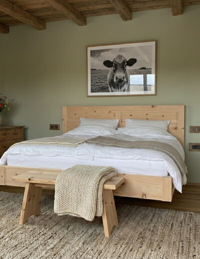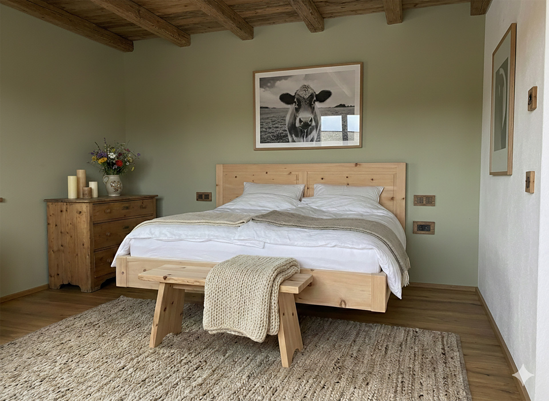 Erholsamer Schlaf im Zirbenbett: Im separaten Schlafzimmer erwartet Sie das Beste, was die Natur für Ihren Schlaf zu bieten hat. Ein massives Zirben-Doppelbett sorgt für einen beruhigenden Duft, während Sie auf hochwertigen ADA-Matratzen wie auf Wolken gebettet sind.