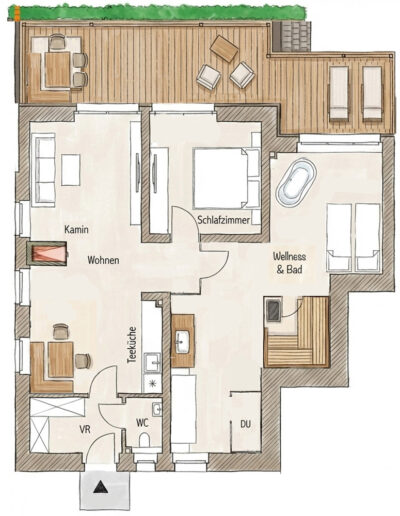 Gartenlust und Terrassenfreiheit: Vom Wohnraum, dem Schlafzimmer und dem Spa-Bereich treten Sie direkt hinaus auf Ihre 35 m² große private Terrasse. Von dort aus haben Sie direkten Zugang zu unserem 35 Hektar großen Garten, wo Sie die namensgebende Wildwiese und die Ruhe der Oststeiermark hautnah spüren können.